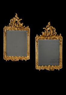 Die Rokoko-Spiegel sind individuell asymmetrisch gestaltet, spiegeln sich aber und stellen daher als Paar ein harmonisches Ensemble dar. Die feine, federartige Schnitzarbeit beider Spiegel ist durch das friderzianische Rokoko beeinflusst.